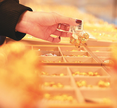 在浙江省湖州市德清县乾元镇一家金店,店员整理黄金首饰。 倪立芳摄(新华社发)